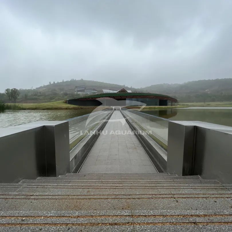 鳳棲湖亞克力棧橋是藍湖水族特別為溧陽科創基地規劃設計,景觀橋與鳳棲湖風景相得益彰。全透明的亞克力面板打造的橋梁增加游客觀賞美景的視野同時,其張力結構更展現出橋梁的力度美和結構美,全玻璃景觀橋與波光水面完美融合,當人們在橋上走過,就如同在水中漫步。