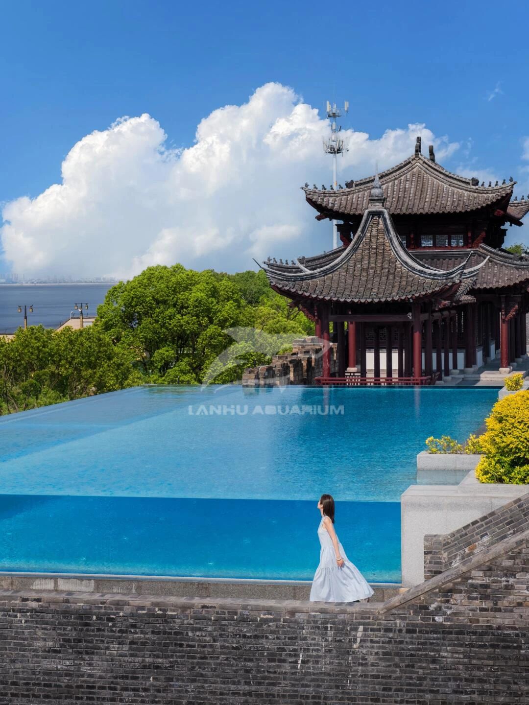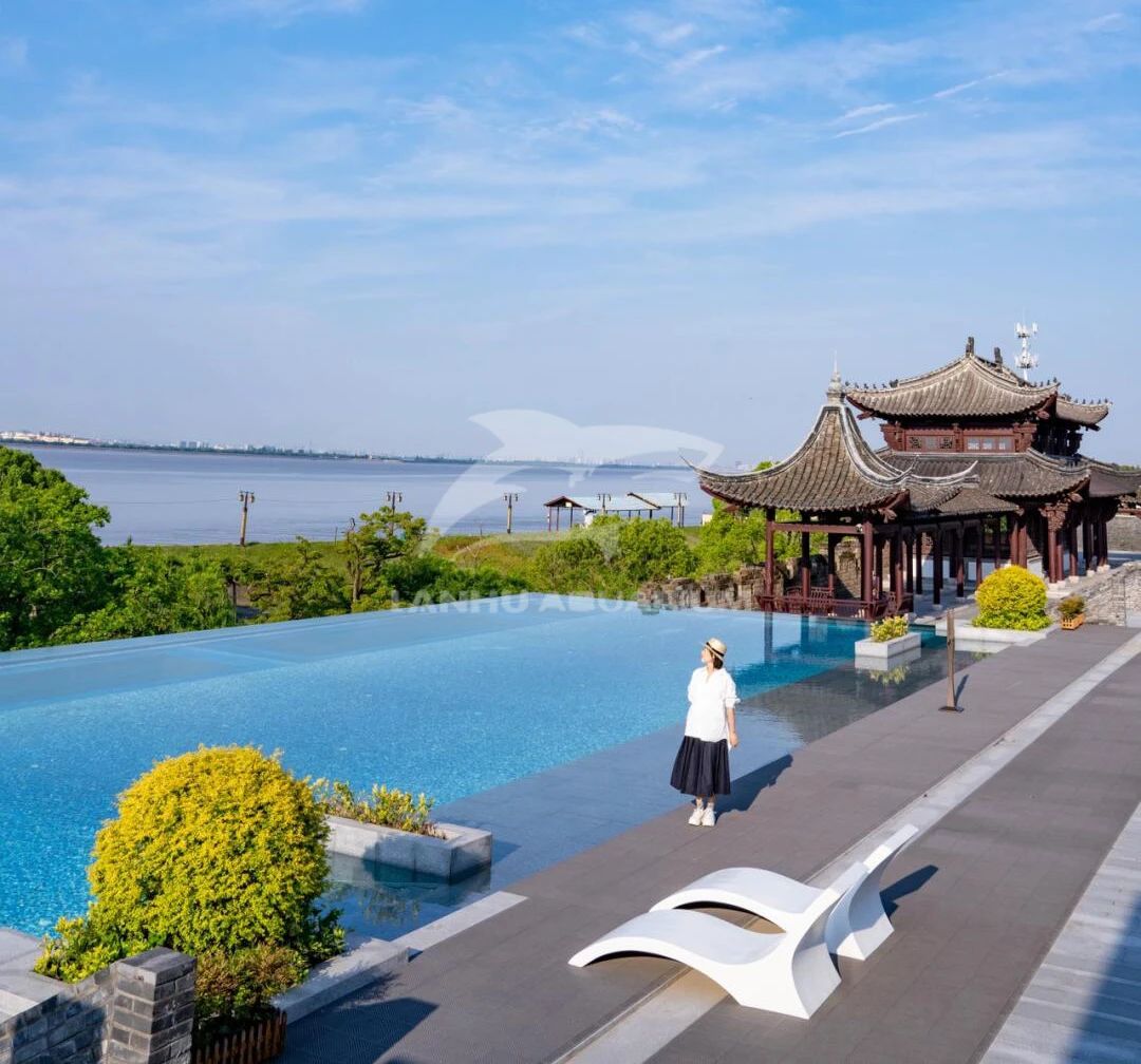 上海藍湖水族工程有限公司打造浙江鹽官透明亞克力泳池項目完工,讓游客們既能在錢塘江發呆也能在這片無邊泳池擁抱日落橘子海